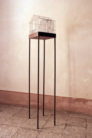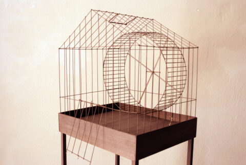 Habitat is a cage built on anthropometric measurements, a 1:10 scale model, “tailored” for average-height humans. The slender bars suggest voluntary confinement, perhaps a choice, even if unconscious. The playful aspect becomes almost obsessive, intensified by the sinister emptiness of the cage and the size of its wheel, which transforms from an animal “toy” into a specter of alienation.