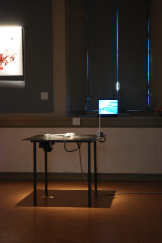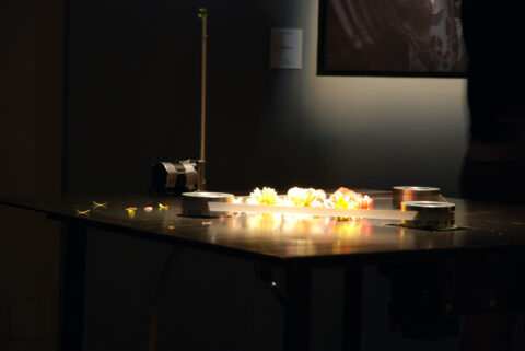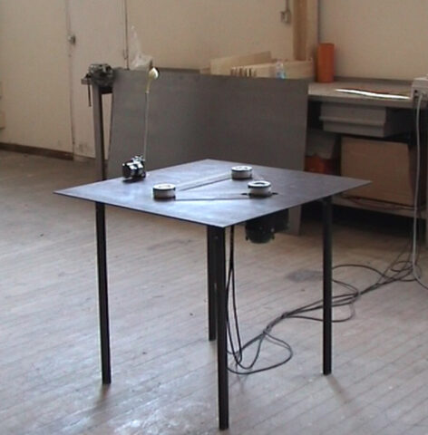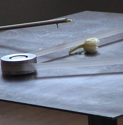 This installation consists of an iron table (94x94x80 cm) on which three aluminum rollers rotate a strip of paper. A small motor controls the movement of a mechanical arm that holds a flower. The flower is inexorably guided towards the blade, leading it to an inevitable end.